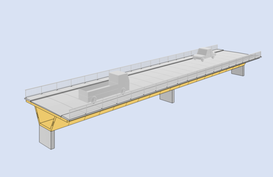 Die Brückenelemente sind für eine Brücke quer zur Achse geplant. Damit kann beispielsweise eine Kantonsstrasse über eine 6-spurige Autobahn mit einer Mittelabstützung ausgeführt werden. Die einzelnen Platten der Elemente sind mit der TS3-Technologie biegesteif verbunden, dadurch wird die Torsionssteifigkeit erhöht und die einzelnen Platten wirken effizient zusammen. Für die Erstellung einer Brücke werden mehrere Elemente aneinandergereiht, mit der TS3-Technologie verbunden und anschliessend vorgespannt.