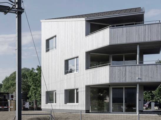 Die Vorteile der Holzbauweise sind deutlich sicht- und spürbar: In nur gerade einer Woche wurde das stattliche Gebäude aufgerichtet. Die sehr kurze Bauzeit ermöglichte den Verzicht von aufwendigen Sicherungsmassnahmen entlang der Bahngleise. Im Inneren bieten die farblos lasierten Holzdecken eine angenehme Wohnatmosphäre. Aussen strahlt der Holzbau mit einer hinterlüfteten, silbergrau pigmentierten Holzschalung. Die zurückhaltende Farbgebung verleiht dem Neubau einen zeitgemässen, architektonischen Ausdruck und schafft Assoziationen zum traditionellen Holzbau.