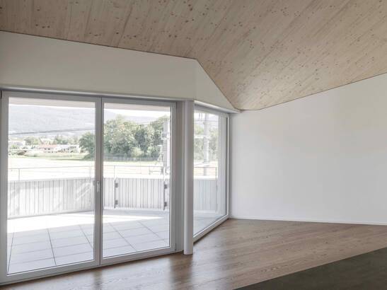 Das neue Mehrfamilienhaus in Buchs AG kombiniert die Vorteile des Holzbaus und der Massivbauweise. Die nur 39 Zentimeter dünnen Geschossdecken aus Holz liegen auf filigranen Stützen – Unterzüge sind nicht nötig. So werden die grossen Räume und Fensterfronten nicht durch störende Querbalken beeinträchtigt. Das ist dank der TS3-Technologie möglich.