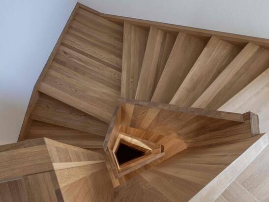 Die aus massiver Eiche konstruierte Holztreppe, welche nur ein paar Tage vor dem Bezug der Wohnungen aufgerichtet wurde, windet sich wie eine Spirale in die Höhe und verbindet die drei Geschosswohnungen inkl. Keller miteinander. Bei Mehrfamilienhäuser mit geringer Höhe (unter 11 Meter) dürfen Treppenhäuser statt RF1 (nicht brennbare Materialien) auch RF2 (schwer brennbare und nicht brennbare Materialien) ausgeführt werden. Das ermöglicht die schöne Eichentreppe. Sie dient als Fluchttreppe und ist in einem Treppenhausschacht aus Brettsperrholz montiert. Das Brettsperrholz ist für den Brandschutz gekapselt (mit Gipsfaserplatten verkleidet).