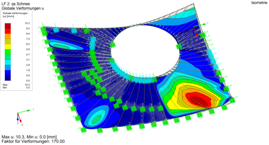 Das weit auskragende und geschwungene Dach ist lediglich auf vier Stützen gelagert. Mit einem 3-D-Modellierung im RFEM werden die resultierenden Kräfte berechnet.