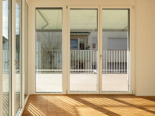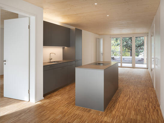 Für die Konstruktion der Geschossdecken wurden Hohlkastenelemente mit einer Spilttfüllung und Mineralwolle im Deckenelement gewählt. Diese Holzdecken bleiben in den Wohnungen sichtbar und verleihen den Räumen eine angenehm wohnliche Atmosphäre. Auch schalltechnisch schneidet die Konstruktion sehr gut ab.