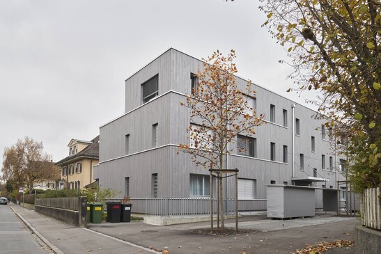 Die Anforderungen des Programms verlangten günstigen Wohnraum. Die Antwort war ein kompakt strukturierter Baukörper vorwiegend aus Brettsperrholzplatten. So können die Proportionen zwischen Volumen, Oberfläche und Bauteilanschlüssen optimiert werden. Nicht beheizte Bereiche wie Balkone werden als selbsttragende Bauteile dem Hauptvolumen angefügt. Die gleichwertige und homogene Materialisierung schafft eine Einheit, welche in ihrer Tiefenwirkung von Licht und Schatten den Bezug zum Gartenraum schafft. Das konsequente Raster ist der räumliche Ausdruck des vorfabrizierten Holzbaus. Das Layout der Wohnungen, geprägt durch die Holzbaustruktur ist so angelegt, dass die innere Erschliessung praktisch ohne Flächenverlust funktioniert.
