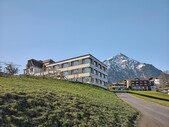 Das Primarschulhaus in Aeschi bei Spiez wurde durch einen dreigeschossigen Neubau in Holzbauweise erweitert. Im neuen Schulhausteil befinden sich Schulzimmer, Gruppen- und Werkräume und Platz für einen Kindergarten. Die drei überirdischen Geschosse wurden komplett in Holz erstellt. Das Sockel- und Untergeschoss wurden betoniert. Beim Bau des Gebäudes wurde bereits an die Zukunft gedacht: Die Innenwände sind nicht tragend und ermöglichen so maximale Nutzungsflexibilität. Zudem sind alle Bauteile so dimensioniert, dass das Schulhaus zu einem späteren Zeitpunkt um ein Geschoss aufgestockt werden kann. Dazu werden die Kräfte grösstenteils über die unten eingespannten und die gesamte Gebäudehöhe durchlaufenden Holzstützen abgeleitet.
