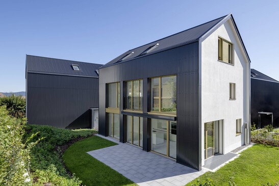 Die Einfamilienhäuser haben ebenfalls eine Dachkonstruktion aus Holz und wurden auch als Massivbau mit nicht tragenden Fassadenelementen in Holzrahmenbauweise erstellt. Alle speziellen Anschlüsse und Abdichtungen, welche dafür notwendig waren, wurden durch Timbatec geplant. Bei diesen Häusern stand die Fassadenplanung beziehungsweise die Dichtheit der Gebäudehülle im Vordergrund. Hier wurde eine hinterlüftete Blechfassade auf die nichttragenden Holzelemente geplant, welche ohne sichtbaren Übergang in die Bekleidung vom Steildach übergehen sollte. Um dies zu ermöglichen, wurden als Dachbekleidung die gleichen Bleche wie in der Fassade verwendet.