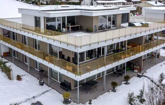 Die Aussenabmessungen der beiden Mehrfamilienhäuser wurden dem nicht regulären Grundstückgrundriss angepasst. Dies hat unregelmässige Gebäudegrundrisse zur Folge mit schrägen Wänden und zurückversetzten Geschossen. Hauptsächlich das zurückversetzte Attikageschoss, bei welchem die Lasten über dem darunter liegenden grosszügigen Wohn- und Essbereich abgetragen werden mussten, stellte eine Herausforderung dar. Die Lasten konnten mit Hilfe von einzelnen in der Geschossdecke integrierten Stahlträgern abgetragen werden.