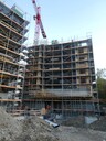Die vier Gebäude sind in Hybridbauweise erstellt worden. Der Treppenhauskern, die Innenstützen und Decken sind aus Stahlbeton. Die Aussenwände sind aus Holz. Die tragenden Stützen sind in den Rahmenbauwänden integriert und werden als Element versetzt.