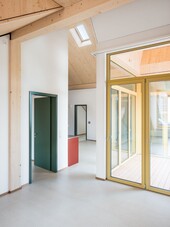 Das Gesundheitszentrum ist ein Holz-Skelettbau mit sichtbarer Balkendecke, das Treppenhaus ist in Beton.