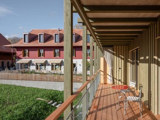 Mit dem Laubengang, den Steildächern und Holzfassaden gelang die Eingliederung in die ländliche Umgebung.