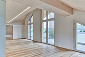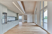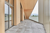 Speziell an diesem Bauwerk sind die weit auskragenden Balkone. Damit auf störende Stützen verzichtet werden kann, entwickelten wir eine aufgehängte Konstruktion. Stahlseile nehmen die Kräfte der Balkone auf und leiten die Kräfte über eine Konsole in die Tragstruktur der Aussenwände ein. Hier können sie das ausgeklügelte Detail drehen und wenden wie sie wollen.
