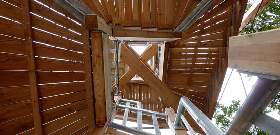 Erster Preis beim Projektwettbewerb Turm Altberg! Ein Holzturm mit palisadenähnlicher Stützenanordnung auf den Grudrissdiagonalen, einem sich nach oben öffnenden Treppenaufgang und überdachter Aussichtsplattform auf gut 30 m Höhe.