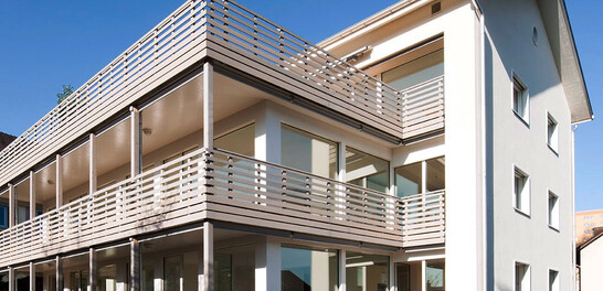 Die Grundlage Im Zuge einer Gesamtsanierung wurden Wohnungen durch einen Anbau in Holz erweitert. Der so entstandene Wohnraum mit Veranda stellt einen Mehrwert für die Wohnungen im Parterre und im 1. OG dar. Auf der neuen Flachdachfläche sind zwei einladende Terrassen entstanden, die zu den Wohnungen im 2.OG gehören. Mit einer vorgefertigten neuen Aussenhülle wurde das Gebäude auf Minergie-P Standard aufgerüstet.   Als erster Schritt mussten alle der Fassade vorstehenden Balkone, Fenstergewände Vordächer, ort- und giebelseitig auf Niveau Wandfläche zurückgeschnitten werden. Um die Holzbauelemente an die bestehende Fassade anzuschliessen, wurden neue Streifenauflager geschaffen.