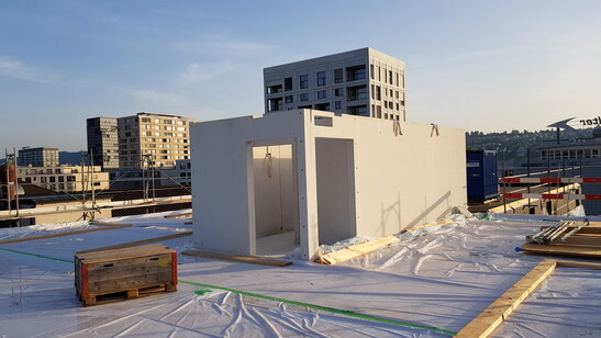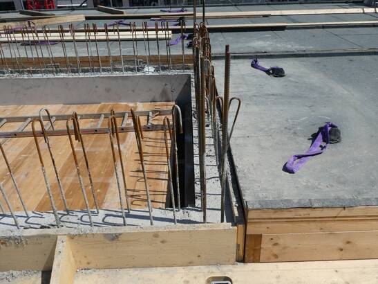 Die Vorteile der neuen Vorgehensweise liegen auf der Hand: Es braucht deutlich weniger Stahlprofile und Schrauben, die Verbindung vom Holzbau zum Betonkern ist einfacher und die Bauzeit kürzer. Der Auf- und Abbau des Gerüstes und der Schalung für den Betonkern entfällt und die Menge des eingesetzten Betons kann reduziert werden. Dies bei gleicher Leistung: Der nachträglich eingegossene Beton ist form- und kraftschlüssig mit dem Holzbau verbunden. Die Treppenhauskerne dienen der statischen Aussteifung der Gebäude und stellen die Fluchtwege im Brandfall sicher.