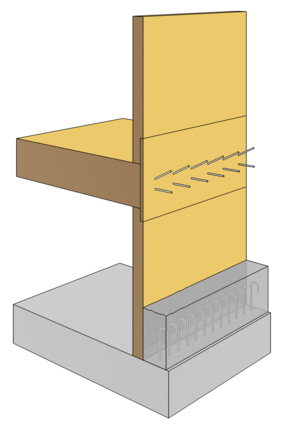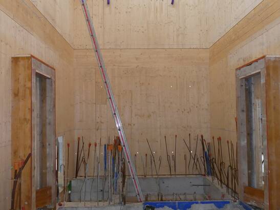 Die 42 Millimeter dicken 3-Schichtplatten wurden für den Brandschutz auf der Rauminnenseite mit 3x15 Millimeter Gipsfaserplatten verkleidet. Auf der anderen Seite dient die Platte als verlorene Schalung für den Beton. Bis der Beton ausgehärtet ist, wird das Treppenhaus provisorisch verstärkt.