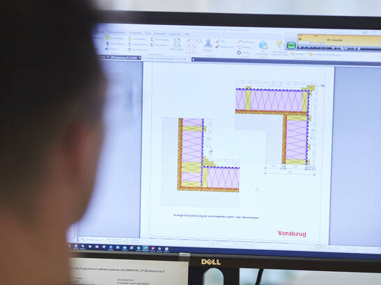 Im Ausführungsprojekt erstellen unsere Techniker die Werkplanung und zeichnen Werkstattpläne dreidimensional. Sie setzen dabei die Software cadwork ein. Zur Überprüfung der bauphysikalischen Anforderungen werden Baukontrollpläne gezeichnet und wo nötig, werden WUFI-Simulationen oder hygrothermische Simulationen erstellt. Alle unsere Techniker haben jahrelange Planungs- und Baustellenerfahrung. Unsere Details sind daher technisch hochstehend gelöst und praxistauglich. Werden die Werkstattpläne von Dritten angefertigt, kontrollieren wir diese im Hinblick auf die Übereinstimmung mit den bauphysikalischen Anforderungen und den Ingenieurplänen.