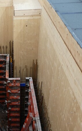 D'abord le bois, ensuite le béton : les panneaux à trois couches sont à la fois la paroi intérieure et le coffrage perdu pour l'escalier. noyau de la cage d'escalier en béton.