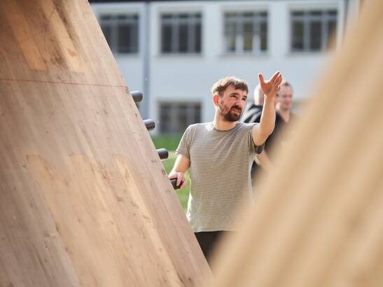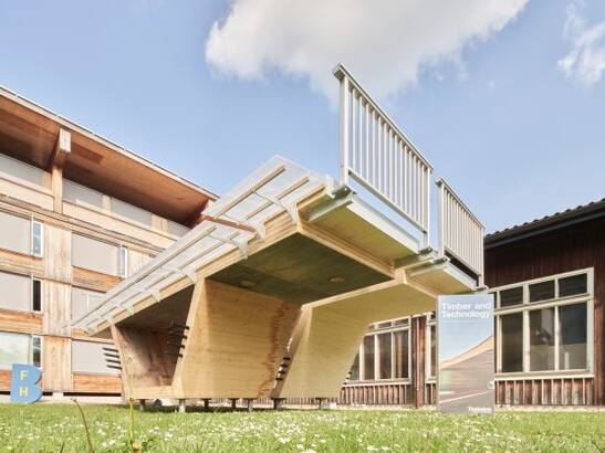 L'équipe de Martin Geiser, directeur de l'Institut pour la construction en bois, les structures porteuses et l'architecture (IHTA), a présenté, à l'aide de projets concrets, les performances du bois pour la décarbonisation des constructions d'infrastructures. Outre les passages à faune en bois, l'accent a été mis en particulier sur l'étude de faisabilité des ponts pour charges lourdes. Une maquette correspondante dans la cour intérieure a servi d'exemple illustratif.