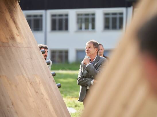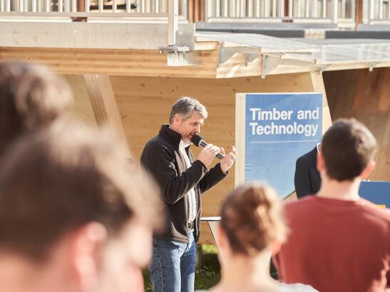 Erich von Siebenthal, conseiller national et président de Lignum Berne, a ouvert la manifestation. Il a été suivi par les discours de Sebastian Wörwag, recteur de la HESB, et de Peter Staub, directeur du département Architecture, bois et génie civil, qui ont mis en évidence les efforts déployés en faveur du développement durable.
