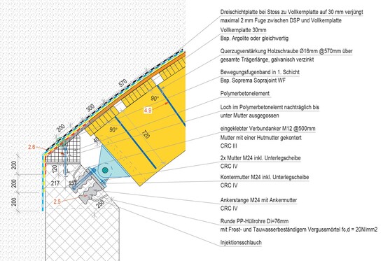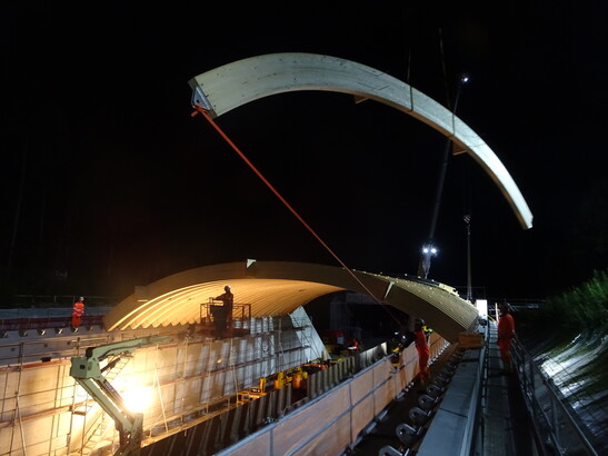 L'exécution a été confiée à l'ARGE FERA avec Aarvia Bau AG et Häring AG. Les 156 poutres en arc BSH nécessaires ont été préfabriquées chez Hüsser Holzleimbau AG à Bremgarten. Les poutres mesurent 17,4 mètres de long, ont une section de 24 par 76 centimètres et pèsent chacune deux tonnes. Pour ce faire, des planches d'épicéa ont été collées de manière indéformable à l'aide d'une grande presse à encoller et d'une colle RF. Des articulations en acier situées de part et d'autre des poutres servent d'appui.