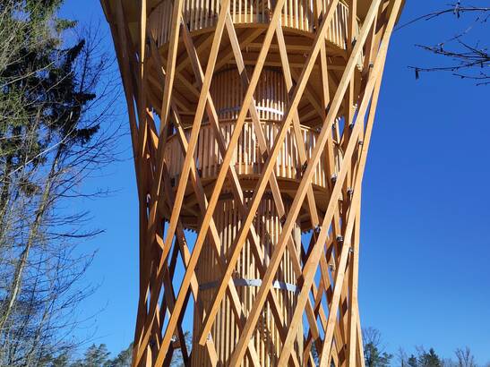 La structure portante de la tour se compose de barres de mélèze croisées et assemblées en un treillis hyperbolique. Ce type de construction assure une grande stabilité structurelle, favorise un drainage ciblé et s'intègre harmonieusement dans le paysage naturel de la plaine alluviale. Deux plateformes d'observation situées à huit et douze mètres de hauteur offrent des vues impressionnantes sur la Thur et la nature environnante.