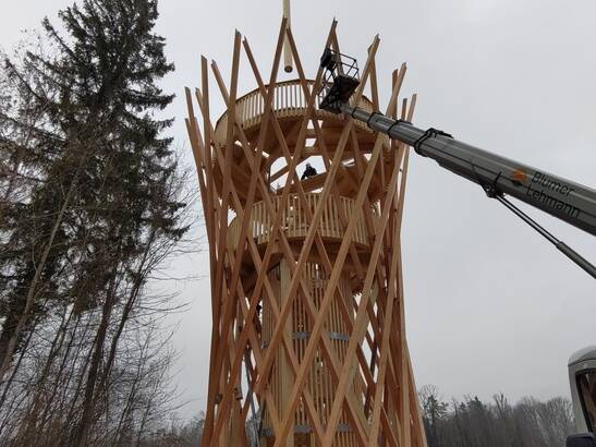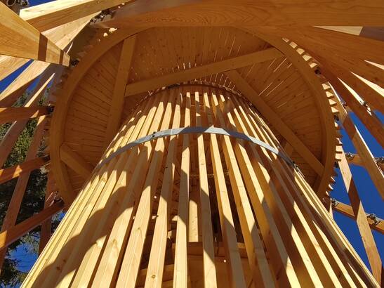 Deux types de bois ont été utilisés : du mélèze pour la structure extérieure exposée aux intempéries et du bois d'épicéa pour l'intérieur protégé de la tour. La construction repose sur des fondations massives en béton et se termine par un toit à végétation extensive - une plus-value écologique qui crée un espace vital supplémentaire pour les insectes.