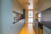 Les structures des éléments de construction sont très minces. Les plafonds sont constitués de panneaux CLT de 120 mm et la structure du plancher mesure 130 mm (250 mm au total). Les cloisons des appartements comportent des montants décalés de 120 mm et un double revêtement des deux côtés. (Épaisseur des murs : 180–190 mm).