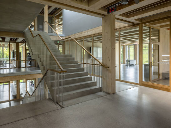 Für die Schule in Prêles wurde die direkte Nutzung des eigenen Holzes gewählt. Die Fichten, die einst auf dem Plateau de Diesse wuchsen, sind heute Stützen, Träger, Wände und Decken der neuen Schule. Fichtenholz wächst schnell und hat gute Holzeigenschaften für den Bau von Gebäuden. An ausgewählten Stellen wird auch Buchenholz eingesetzt. Zum Beispiel als Träger der 13 Tonnen schweren Treppe mitten im Schulhaus. Sie wurde als Fertigbetonteil auf die Baustelle geliefert und auf die Buchenträger montiert.