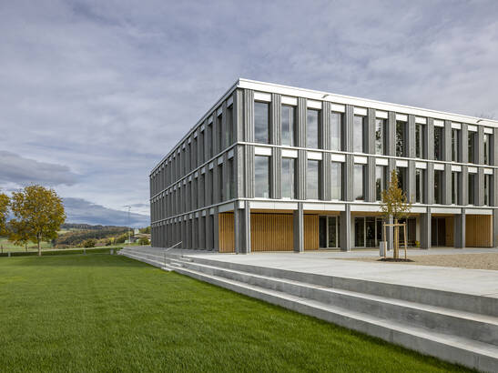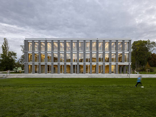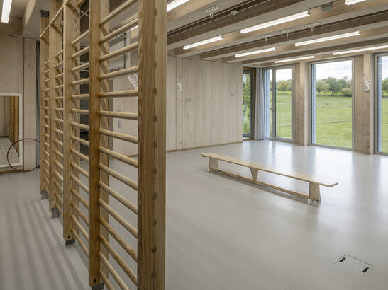Die neue Schule kombiniert die Holzmassiv- und die Rahmenbauweise geschickt: Alle Geschossdecken und ein Teil der Innenwände für die Gebäudeaussteifung sind in Holzmassivbauweise aus Brettschichtholz erstellt. Die restlichen Innenwände sind nicht tragende Rahmenbauten. Die warmen Oberflächen von Holzwänden und -decken, sowie der ständige Austausch des Holzes mit der Luftfeuchtigkeit ergeben ein gutes Raumklima. Gut gedämmte Wände sind wichtig: Denn, je kleiner die Differenz zwischen der Oberflächentemperatur der Wände, Böden und Decken zur Lufttemperatur ist, desto behaglicher ist es in einem Raum. Darum fühlen wir uns in Holzgebäuden mit guter Wärmedämmung wohl – auch bei etwas tieferer Raumtemperatur. So können Gebäude energiesparsamer betrieben werden. Zudem hat Holz eine gefühlt höhere Oberflächentemperatur als Beton, Stahl oder Glas, was das Wohlbefinden zusätzlich steigert.
