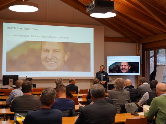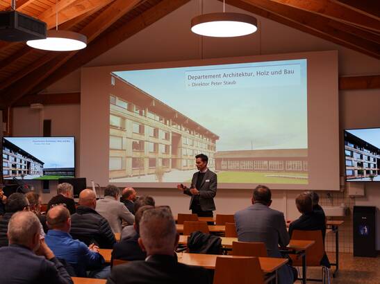 Erich von Siebenthal, Nationalrat und Präsident Lignum Bern, eröffnete den Anlass. Ihm folgten Ansprachen von Sebastian Wörwag, Rektor der BFH, und Peter Staub, Direktor des Departements Architektur, Holz und Bau, welche die Bestrebungen für die nachhaltige Entwicklung aufzeigten.