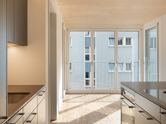 Für die Konstruktion der Geschossdecken wurden Hohlkastenelemente mit einer Spilttfüllung und Mineralwolle im Deckenelement gewählt. Diese Holzdecken bleiben in den Wohnungen sichtbar und verleihen den Räumen eine angenehm wohnliche Atmosphäre. Auch schalltechnisch schneidet die Konstruktion sehr gut ab.