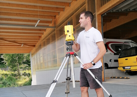 In Birmensdorf wird ein Gewerbehaus aufgestockt. Die Aufstockung ist vom bestehenden Nachbargebäude her mit einer 35 Meter langen Holzrampe erschlossen und dient als Parkdeck für Motorfahrzeuge. Diese Woche haben die Bauaufnahmen mit dem Tachymeter stattgefunden. Sie sind die Grundlage für die detaillierte Planung.