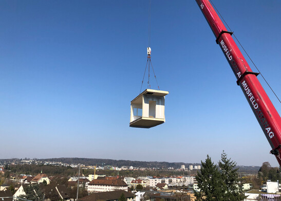 Während mehreren Wochen stellten Zimmerleute der Stamm Bau AG 28 Holzmodule her. Sie lassen sich in der Fabrikhalle millimetergenau herstellen – eine Genauigkeit, die auf der Baustelle nicht möglich wäre. In nur einem Tag hievt der Kran alle Module in luftige Höhen. Auf dem Flachdach des bestehenden Westflügels montieren die Handwerker die Holzmodule. Damit schaffen sie Platz für neue Büroräume im Spital Dornach.