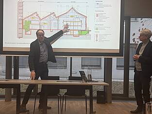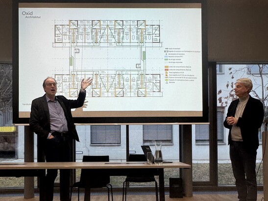 Im gemeinsamen Teil präsentierteYves Schihin ausgewählte Projekte der letzten 15 Jahre. Anhand realisierter Wohn- und Umnutzungsbauten erläuterte er architektonische Strategien, etwa kompakte Typologien, klare Erschliessungssysteme oder gezielte Kombinationen von Holz und mineralischen Bauteilen.Andreas Burgherr kommentierte dazu die spezifischen Anforderungen der Brandschutzlösungen – vom Entwurf bis zur Umsetzung, praxisnah aus erster Hand.