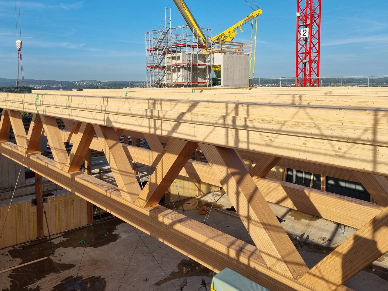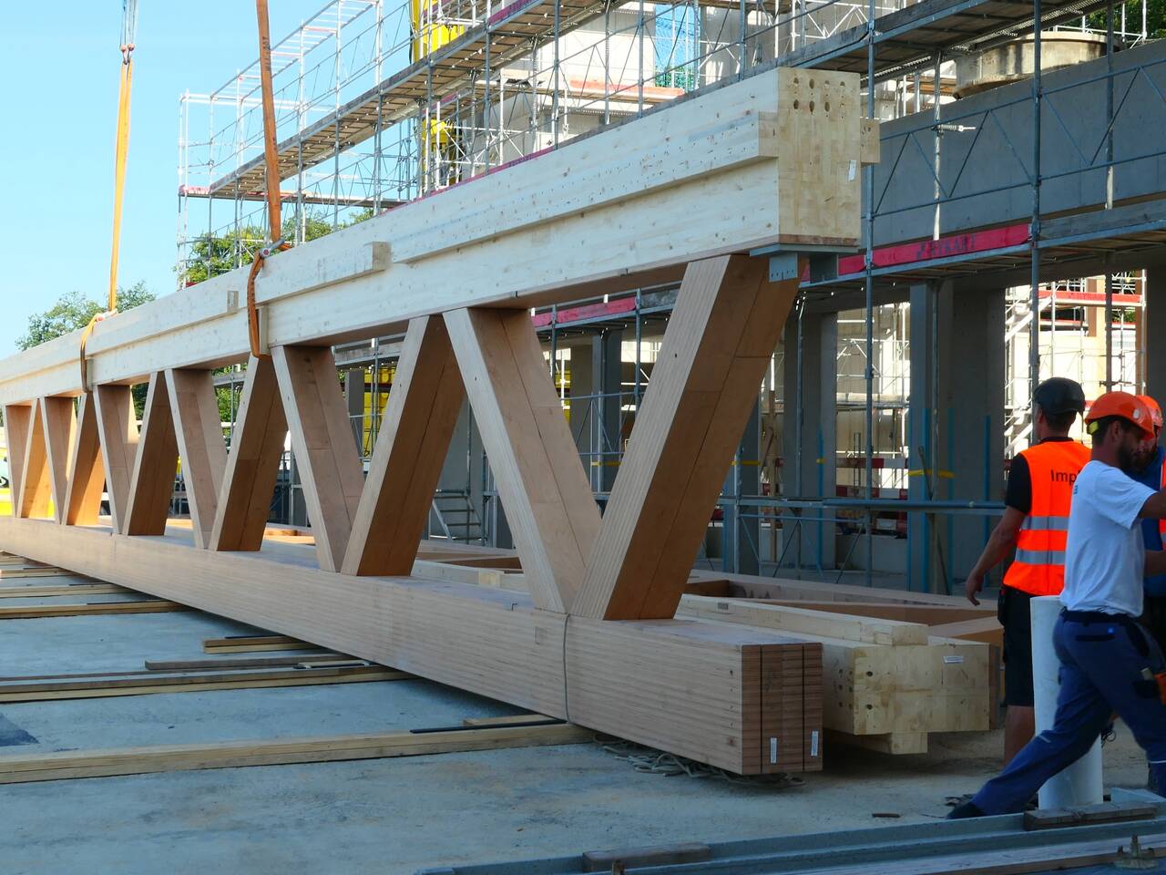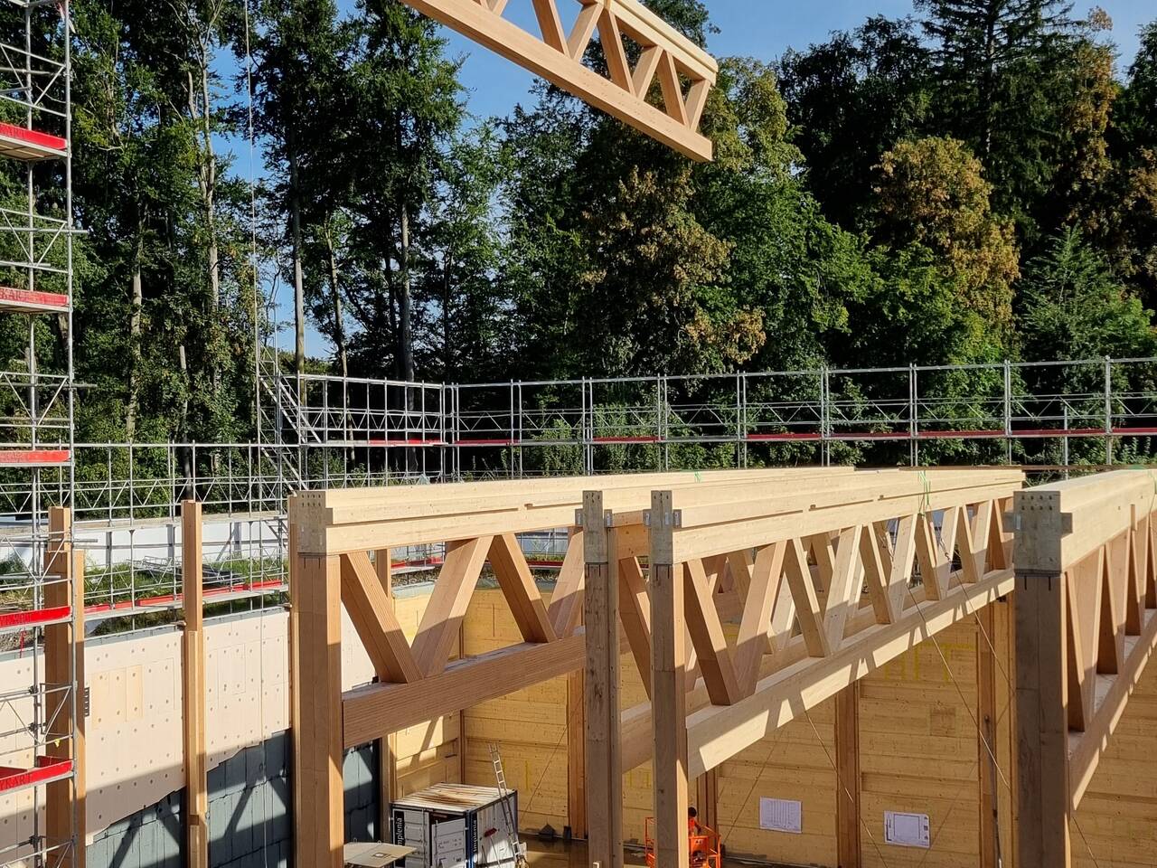 Beim Grossprojekt Schulensemble Neubau, Umbau und Instandsetzung 👉«Projekt Nägelimoos» in Kloten/ZH baute die Implenia Schweiz AG Holzbau imposante Fichte/Bau-Buche Fachwerke ein, welche über eine Länge von knapp 30 m die neue 2-fach Turnhallendecke überspannen. Die vorgefertigten Hightech-Holzbauteile haben eine Höhe von rund 3.20 m. Im Anschluss werden darauf auf zwei Geschossen weitere Holzelemente aufgesetzt, welche einen Mehrzweckraum mit Bühne und weitere Klassenzimmer mit Gruppenräumen ausbilden.