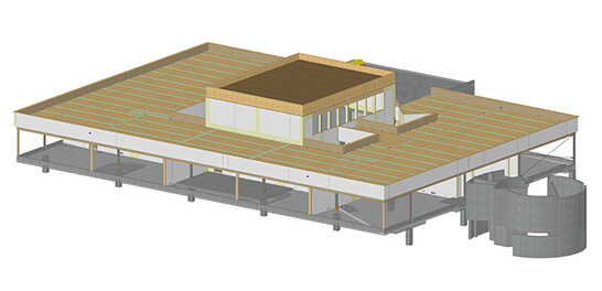 Die Ausgangslage Der Bau war eine Stahlbeton-Konstruktion mit Pilzdecken und eingespannten Stützen. Der Stützenraster von 9m musste auch für die Aufstockung eingehalten werden.    Die Herausforderung Das Primärtragwerk wurde aufgrund der hohen Lasten in Stahl realisiert und die Dachelemente in Holzbauweise.