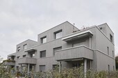 Die Anforderungen des Programms verlangten günstigen Wohnraum. Die Antwort war ein kompakt strukturierter Baukörper vorwiegend aus Brettsperrholzplatten. So können die Proportionen zwischen Volumen, Oberfläche und Bauteilanschlüssen optimiert werden. Nicht beheizte Bereiche wie Balkone werden als selbsttragende Bauteile dem Hauptvolumen angefügt. Die gleichwertige und homogene Materialisierung schafft eine Einheit, welche in ihrer Tiefenwirkung von Licht und Schatten den Bezug zum Gartenraum schafft. Das konsequente Raster ist der räumliche Ausdruck des vorfabrizierten Holzbaus. Das Layout der Wohnungen, geprägt durch die Holzbaustruktur ist so angelegt, dass die innere Erschliessung praktisch ohne Flächenverlust funktioniert.