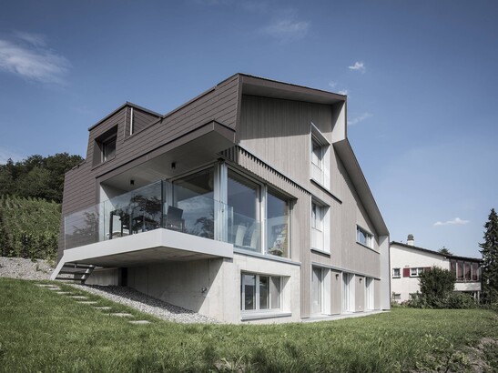 Eine weitere Besonderheit: Beim Haus in Otelfingen sticht sofort die spezielle Form des Daches ins Auge. Das Dach reicht auf der einen Seite des Holzbaus nämlich bis zum Boden und wird damit sozusagen zur – fensterlosen – Hausfassade. Für genügend Helligkeit im Innern sorgen eine grosse Lukarne und die grosszügige Fensterfront beim Wohnzimmer, die das Tageslicht ins Haus fliessen lassen.