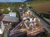 Die Aussenabmessungen der beiden Mehrfamilienhäuser wurden dem nicht regulären Grundstückgrundriss angepasst. Dies hat unregelmässige Gebäudegrundrisse zur Folge mit schrägen Wänden und zurückversetzten Geschossen. Hauptsächlich das zurückversetzte Attikageschoss, bei welchem die Lasten über dem darunter liegenden grosszügigen Wohn- und Essbereich abgetragen werden mussten, stellte eine Herausforderung dar. Die Lasten konnten mit Hilfe von einzelnen in der Geschossdecke integrierten Stahlträgern abgetragen werden.