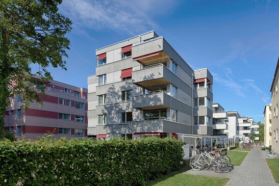 Das 5-geschossige Mehrfamilienhaus an der Wehntalerstrasse wurde mit TS3 CLT-Platten erstellt. Dank denn zweiachsig tragenden Holzdecken konnten die allseitig auskragenden Balkone und Erker effizient und einfach in reiner Holzbauweise ausgeführt werden.