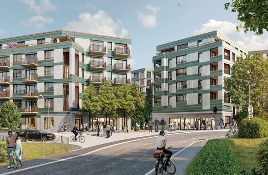 Die vier Gebäude sind in Hybridbauweise erstellt worden. Der Treppenhauskern, die Innenstützen und Decken sind aus Stahlbeton. Die Aussenwände sind aus Holz. Die tragenden Stützen sind in den Rahmenbauwänden integriert und werden als Element versetzt.