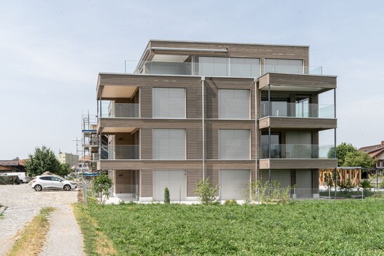 Die Gebäude wurden in nachhaltiger Holz-Elementbauweise errichtet, wobei sowohl Innen- als auch Aussenwände aus vorgefertigten Holzelementen bestehen. Für die Geschossdecken und das Dach kam liegendes Brettschichtholz (BSH) zum Einsatz, was die geforderte Stabilität gewährleistet. Diese Bauweise kombiniert ökologische Verantwortung mit modernem Wohnkomfort und schafft ein gesundes Raumklima.