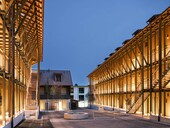 Das Gesundheitszentrum ist ein Holz-Skelettbau mit sichtbarer Balkendecke, das Treppenhaus ist in Beton.