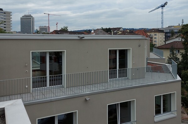 Bei der Aufstockung in Holz sind die Aussenwände aus einer Ständerwand. Aussen ist die Ständerwand mit einer Aussenwärmedämmung versehen und mit einem Abrieb abgeschlossen. Das Dach bilden Hohlkastenelemente, die den Flachdachaufbau tragen.