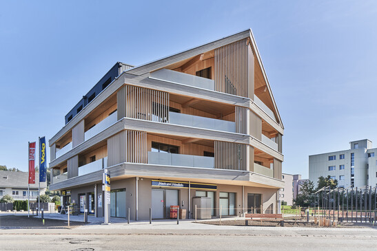 Im Dorfzentrum von Gretzenbach im Kanton Solothurn entstand ein Holzbau mit zwölf Wohnungen und einem Dorfladen. Die Balkone kragen über 3.5 Meter aus – dies ohne störende Stützen. Eine ausgeklügelte, aufgehängte Konstruktion macht es möglich.