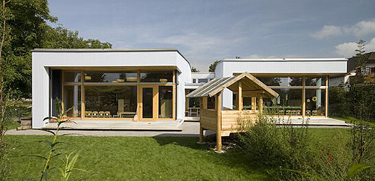Neben Kindergarten und Schulungsräumen ist ein abgekoppelter Geräteraum in die Gesamterscheinung integriert. Der Dämmstandard der Aussenhülle ist dem Minergie-Standard ebenbürtig. Die Installation einer Komfortlüftung sowie die Zertifizierung wurden jedoch nicht durchgeführt. Die Ausführung Das Dachtragwerk ist über 8.70 m frei gespannt, damit ohne Beeinträchtigungen durch Stützen möglichst grosse Räume entstehen. Um die Lasten des schweren Dachaufbaus (extensive Begrünung) aufnehmen zu können, ist das Dach mit einem 320 mm hohen Lignaturkasten überbrückt.