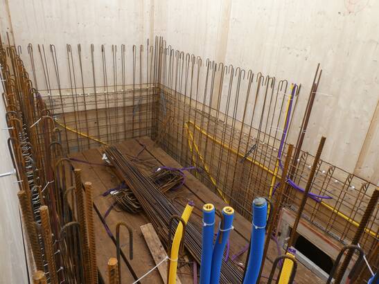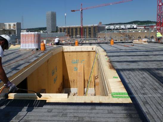 Die Vorteile der neuen Vorgehensweise liegen auf der Hand: Es braucht deutlich weniger Stahlprofile und Schrauben, die Verbindung vom Holzbau zum Betonkern ist einfacher und die Bauzeit kürzer. Der Auf- und Abbau des Gerüstes und der Schalung für den Betonkern entfällt und die Menge des eingesetzten Betons kann reduziert werden. Dies bei gleicher Leistung: Der nachträglich eingegossene Beton ist form- und kraftschlüssig mit dem Holzbau verbunden. Die Treppenhauskerne dienen der statischen Aussteifung der Gebäude und stellen die Fluchtwege im Brandfall sicher.