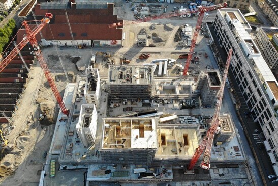 Bei grossen Holzbauprojekten betonieren Baumeister Treppenhäuser oft dann, wenn auf der Baustelle ausser dem Untergeschoss noch nicht viel sichtbar ist. Zimmerleute montieren daran die vorgefertigten Holzbauteile.