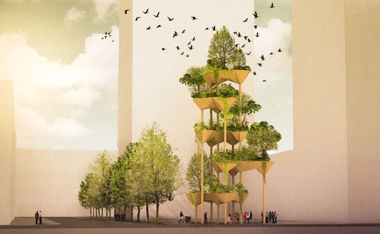 Pour le Tech Cluster Zoug, des chercheurs du du groupe des professeurs d'architecture de l'ETH Fabio Gramazio et Matthias Kohler en collaboration avec Müller Illien Landschaftsarchitekten, Timbatec et d'autres une sculpture architecturale végétalisée. La structure de 22,5 mètres de haut se compose de cinq coques en bois à la géométrie complexe, qui sont - légèrement décalées - sont soutenues par huit minces piliers en acier.