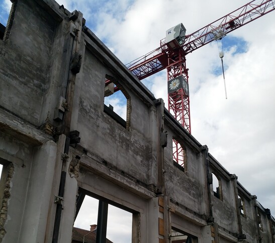 Le bâtiment a été déconstruit, à l'exception de sa façade. Le nouveau bâtiment en bois est maintenant construit derrière.