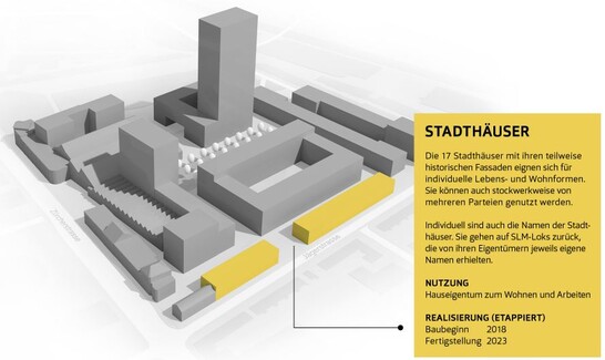 Les 17 maisons de ville avec leurs façades en partie historiques délimitent le site de la Lokstad sur son côté sud-ouest. Source : Implenia, lokstadt.ch
